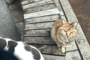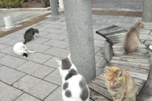 現に私が別の場所にいる猫ちゃん達を撫でに行くと、いつの間にかベンチの下に群がっていました。