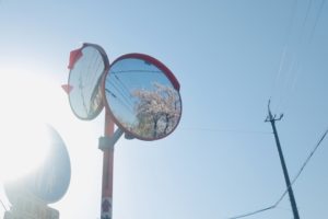 近所のカーブミラーに、桜が映っていました!